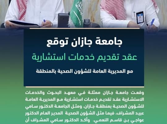 جامعة جازان: إدارة الإعلام وقعت جامعة جازان ممثلة في معهد البحوث والخدمات الاستشارية عقد تقديم خدمات استشارية مع المديرية العامة للشؤون الصحية بمنطقة جازان، ومثل الجامعة الدكتور سامي عبيد المشراف، فيما مثل مدير الشؤون الصحية الدكتور عواجي بن قاسم