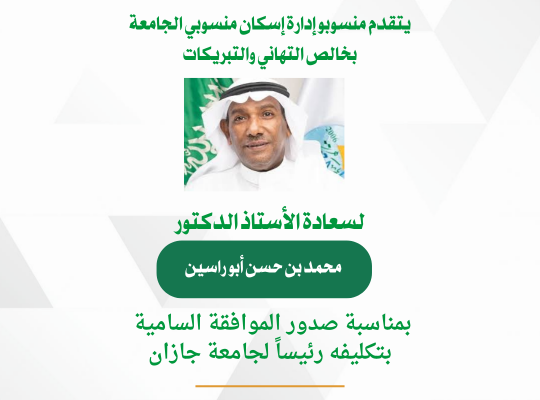 يتقدم منسوبو إدارة إسكان منسوبي الجامعة بخالص التهاني والتبريكات لسعادة الأستاذ الدكتور محمد بن حسن أبو راسين بمناسبة صدور الموافقة السامية بتكليفه رئيساً لجامعة جازان