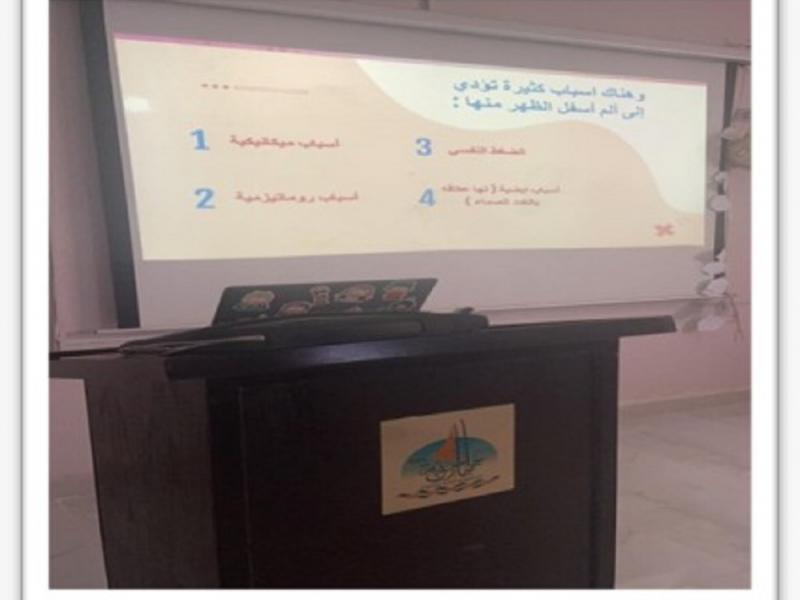 تهدف الورشة الى تقليل نسبة الإصابة بألم الظهر والمحافظة على قوة عضلات البطن والظهر مما يساعد في تقليل اللأم الناتج عن عدم التوازن العضلي، الذي بدوره يسبب في آلام الظهر المزمنة التي قد تحدث عند النساء خصوصاً بعد الحمل والولادة. تناولت الورشة عدة محاور ومنها : أسباب ألم اسفل الظهر أنواع التمارين العلاجية واهمية كلاً منهاو عرض وشرح تمارين الاستطالة عرض وشرح تمارين التقوية.
