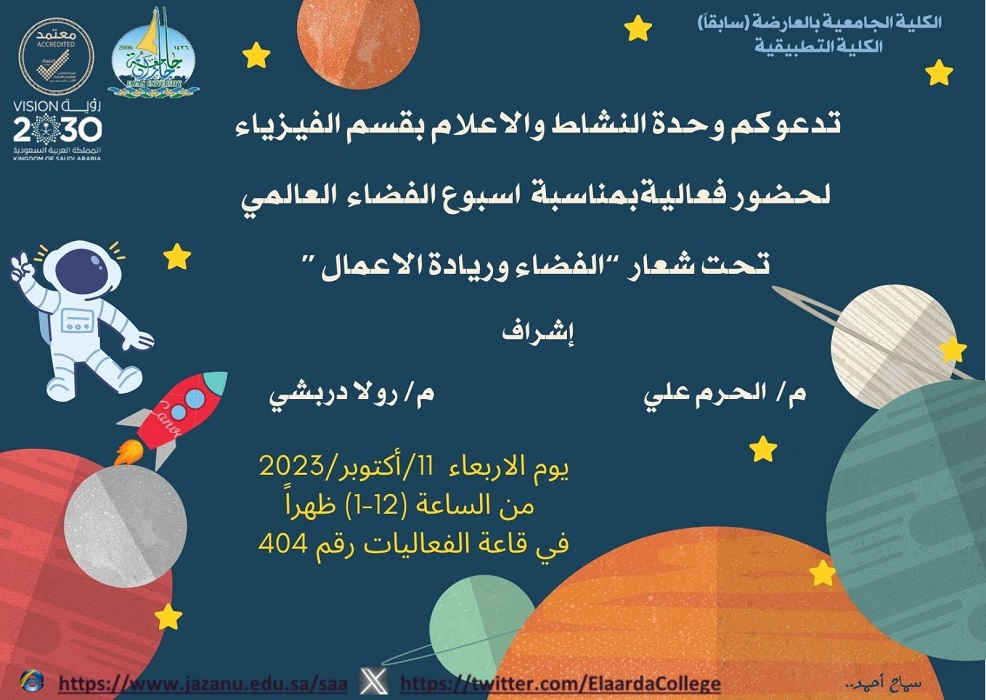 نفذت وحدة النشاط والإعلام لقسم الفيزياء #بالكلية_التطبيقية_بالعارضة_الجامعية (سابقاً) فعالية بمناسبة أسبوع الفضاء العالمي تحت شعار " الفضاء وريادة الأعمال " يوم الاربعاء الموافق 🗒١٤٤٥/٤/٢٦هـ⏰ ١٢ ظهراً📍قاعة الفعاليات بالكلية ٤٠٤