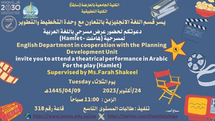 أقام قسم اللغة الانجليزية بالتعاون مع وحدة التخطيط والتطوير عرضًا مسرحيًا لمسرحية هاملت (Hamlet) حيث أدت طالبات القسم مشاهد متنوعة من المسرحية تحت إشراف د. فرح شكيل وذلك اليوم الثلاثاء الموافق ٢٤ أكتوبر