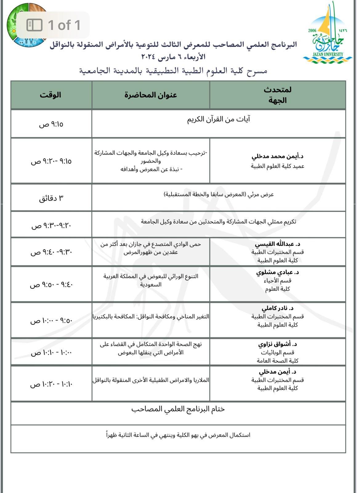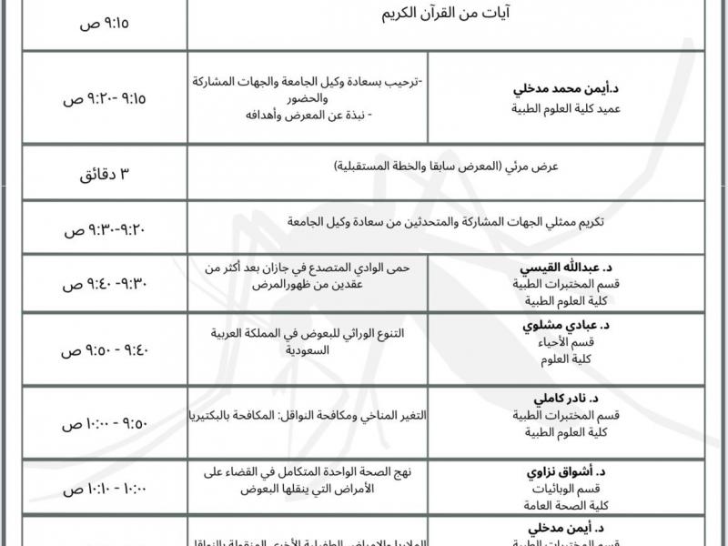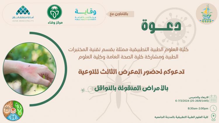 برعاية سعادة وكيل الجامعة للشؤون الاكاديمية الاستاذ الدكتور محمد عريشي وبالتعاون مع كليتي العلوم والصحة العامة نظمت كلية العلوم الطبية التطبيقية ممثلة بقسم تقنية المختبرات الطبية المعرض الثالث للتوعية بالأمراض المنقولة بالنواقل وذلك بمشاركة هيئة الصحة العامة ووقاية بالاضافة إلى مركز وقاء ووفود من مدارس مختلفة في منطقة جازان