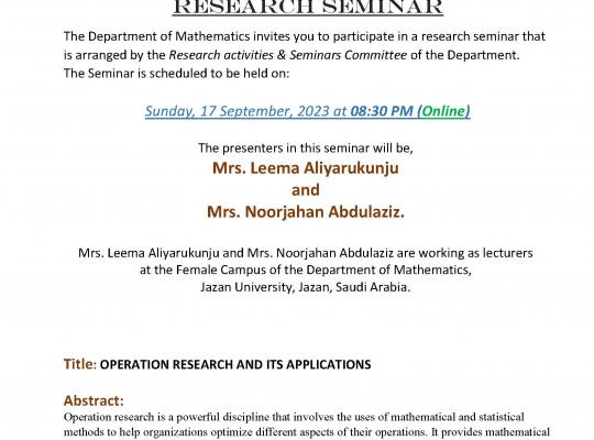 The Department of Mathematics invites you to participate in the upcoming research seminar. Date: 17 September 2023 (Sunday) Time: 08:30 PM (Online) Presenters: Mrs. Leema Aliyarukunju and Mrs. Noorjahan Abdulaziz. Zoom link: https://zoom.us/j
