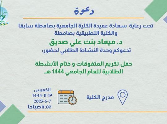 The Applied College in Samtah and the University College in Samtah (formerly) are honored to invite outstanding students to a ceremony honoring outstanding students and the conclusion of activities for the academic year 1444 AH