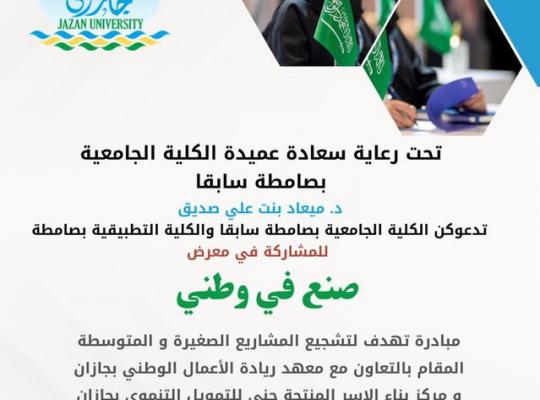The Applied College in Samtah and the University College in Samtah (formerly) are honored to invite you to attend the "Made in My Homeland" exhibition, which is an initiative aimed at encouraging small and medium enterprises.