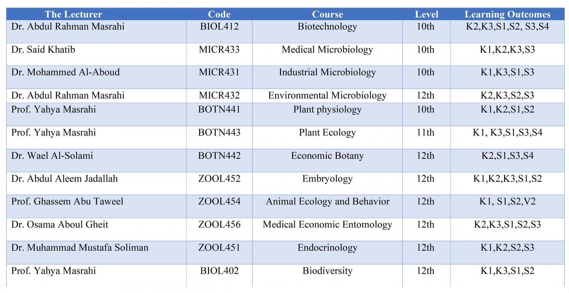 1. To form exit exam sub-committees (exit exam preparation and setting committee – Exam check and mark committee - Statistical analysis committee) and following up them and assessing their progress in preparing and completing the tasks assigned to them. 2. To determine the learning outcomes of the biology program that will be measured in the exam. 3. To set the exam date according to the schedule sent by the Deanship of Academic Development and in coordination with the female section and the Al-Darb branch. 4. To organize awareness-raising meetings for students about the exit exam and its importance for them and for the biology program. In addition to determining the criteria for selecting exam courses and students for the exit exam. 5. To determine the encouragements methods for students targeted by the exam to encourage them to take the exam (such as obtaining a certificate of community or volunteer activity, adding two hours (non-class points) or any other incentives suggested by the committee. 6. Approving the results of the exit exam for the biology department and its branches. 7. Developing improvement plans for the exit exam based on the previous final report and following up on their implementation. 8. To submit proposals to improve the exit exam and mechanisms. 9. Developing a mechanism to measure the impact of the exit exam on improving the learning outcomes of the program (a form for measuring the impact of the proposed improvement after at least two sessions) through the final report that will be submitted to the department council for approval. 10. To cooperate with the supervising college exit exam committee. 11. Cooperation with the Planning and Development Committee of the department. 12. Preparing a database regarding the committee's work and achievements. 13. Organization of periodic meetings for committee members to distribute tasks and submit report of meetings to the department head. 14. To Submit monthly reports to the head of department about the committee's activities, in addition to a comprehensive report on what has been accomplished by the end of the academic year. 15. Any other tasks referred to it by the head of department.