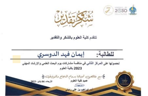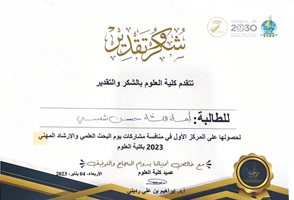 Supervision of master's theses by experienced faculty members has led to the publication of numerous research papers from students’ theses. Additionally, the students achieved first and second places in a scientific forum and received letters of appreciation from the Deanship of Graduate Studies and Scientific Research in recognition of their distinguished research performance.