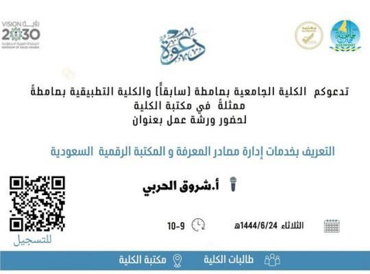 The Applied College in Samtah and the University College in Samtah (formerly) are honored to invite you to attend a workshop entitled "Introducing Knowledge Resources Management Services and the Saudi Digital Library"