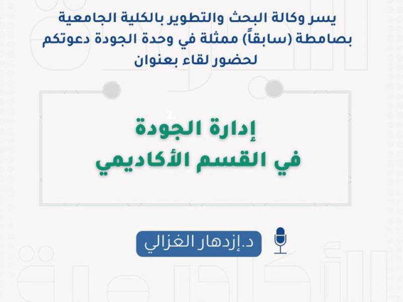 The Vice Dean for Research and Development at Samtah University College (formerly), represented by the Quality Unit, organized a workshop for faculty members entitled “Quality Management in the Academic Department”, presented by: A. Al-Ghazali flourished. It discussed the main objectives of establishing an internal system for quality management in the department's programs, as well as a detailed explanation of the program's quality management plan. It also dealt with the role of the faculty member in the quality committees and the distribution of tasks to faculty members. The quality management plan of the Chemistry Department for the year 1444 AH was presented and discussed with the audience.