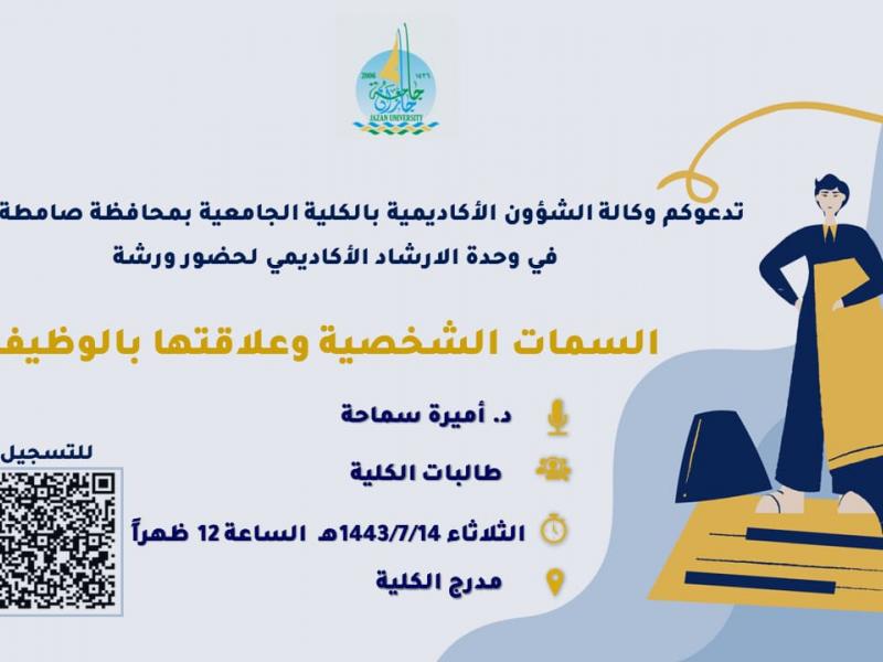 Samtah University College, represented by the Student Guidance Unit, organized a workshop entitled "Personal Traits and their Relationships to the Job". It was carried out by Dr. Amira Bayoumi, in which she talked about physical and personal traits and self-skills as one of the factors affecting career choice. At the beginning of the workshop, she dealt with the nature of personality, then she touched on the most important characteristics of personality and its components, then she talked about the factors affecting personality, and then some theories that explain personality, including the theory of patterns, social learning theory and other important theories. She emphasized at the end of the workshop that a person needs a number of self-skills in order to be able to succeed and excel in the job he occupies.