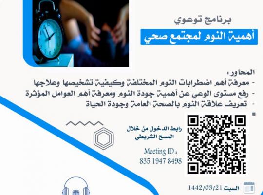 The Community Service Unit at the College of Applied Medical Sciences invites you to attend the awareness program on the importance of sleep for a healthy society. Objectives of the lecture: Know the most important different sleep disorders and how