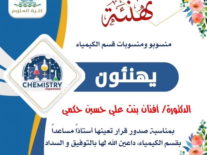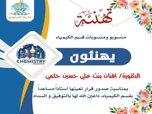 Congratulations to Dr. Afnan bint Hussein Hakami for her appointment as an assistant professor in the Department of Chemistry. He congratulates the staff and employees of the Department of Chemistry, Dr. Afnan bint Ali Hussein Hakami, on the occasion of the decision to appoint her as an assistant professor in the Department of Chemistry, praying to God for her success and success.