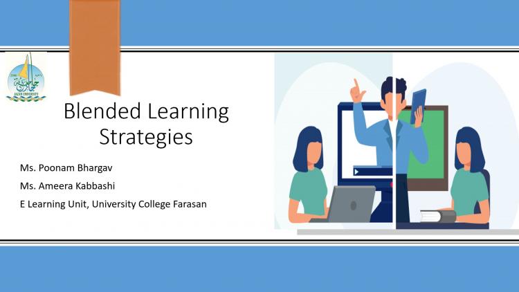 The University College of Farasan, represented by the Learning Resources and E-Learning Unit, under the auspices of the Dean of the College and the supervision of the Vice Dean for Academic Affairs, implemented a training course for faculty members entitled "Blended Learning Strategies and its Applications" which was carried out by and Ms. Poonam Bhargav and Ms. Amira Kabashi in the college’s training hall.