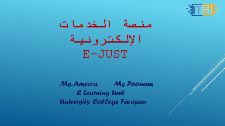 E Learning Resources and E-Learning Unit also held an event entitled: “E-Services Platform of Jazan University E-JUST” sponsored by e-learning , targeting faculty members and administrators, prepared and implemented by Ms. Amira Kabashi and Ms. Poonam Bhargav. Applications of E-JUST were explained.