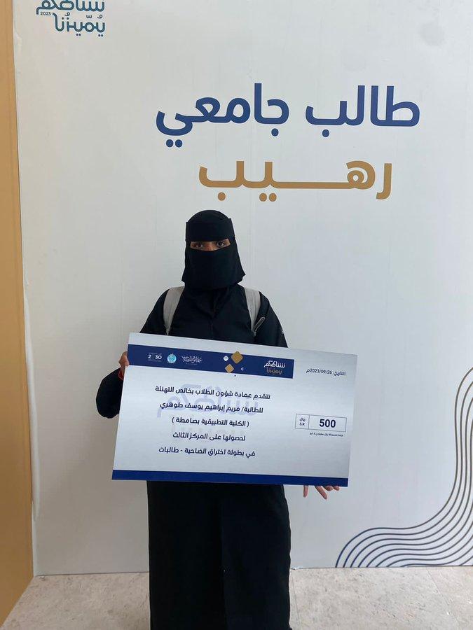 The Samta Applied College and the former Samta University College congratulate the student, Maryam Ibrahim Touhri, in the Chemistry Department, for achieving third place in the inter-college competition, which was held by the Deanship of Student Affairs.