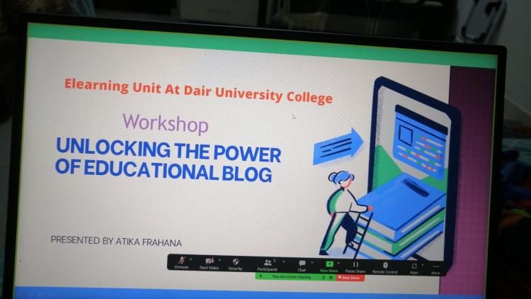 The Elearning Unit at Dair University College conducted online workshop on “Unlocking the power of educational blog” on 11/10/2023 presented by Dr. Atika farhana,Elearning Unit Head. Workshop started with introduction and importance of educational blog and types of different educational blogs then presenter continued the workshop by introducing various applications and tools for blog creation.Practical live training also delivered by presenter to audience explaining creation of good educational blogs and tips to grow and promoting blogs. This workshop ended with open question-answer session. As per the evaluation result audience were happy and satisfied with this workshop.
