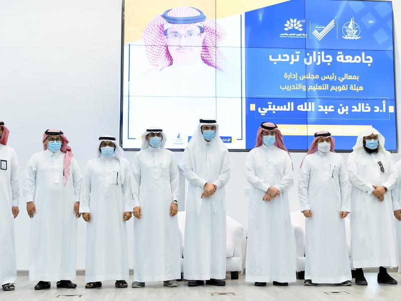 On Monday morning, December 6, 2021, the Education and Training Evaluation Commission, represented by the National Center for Academic Accreditation and Assessment, signed an agreement to accredit 16 academic programs at Jazan University. His Excellency the Chairman of the Board of Directors of the Commission, Dr. Khalid bin Abdullah Al-Sabti, and His Excellency the University President, Prof. Dr. Mar’ei bin Hussain Al-Qahtani, were present at the signing of the agreement in the meeting room of the administrative tower in the University City in Jazan.