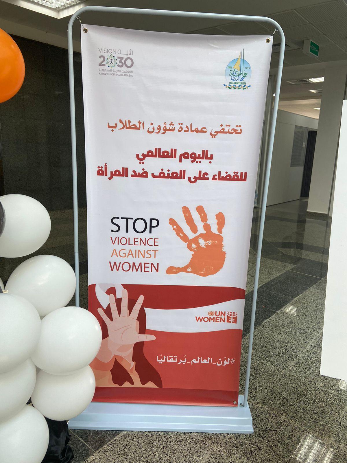 Dr. Al-Bakri confirmed that through this event, we at Jazan University aim to bring awareness regarding the dangers of gender-based violence and to call for an immediate end to all forms of violence against women. We also seek to emphasize the need to protect and support women, especially since violence directed at women and girls is one of the most widespread and destructive. It is a persistent violation of human rights, and its economic cost has become very high, as it hinders women from effectively participating in the society. Therefore, in addition to fairness and equality, the call to stop violence is also a developmental requirement.