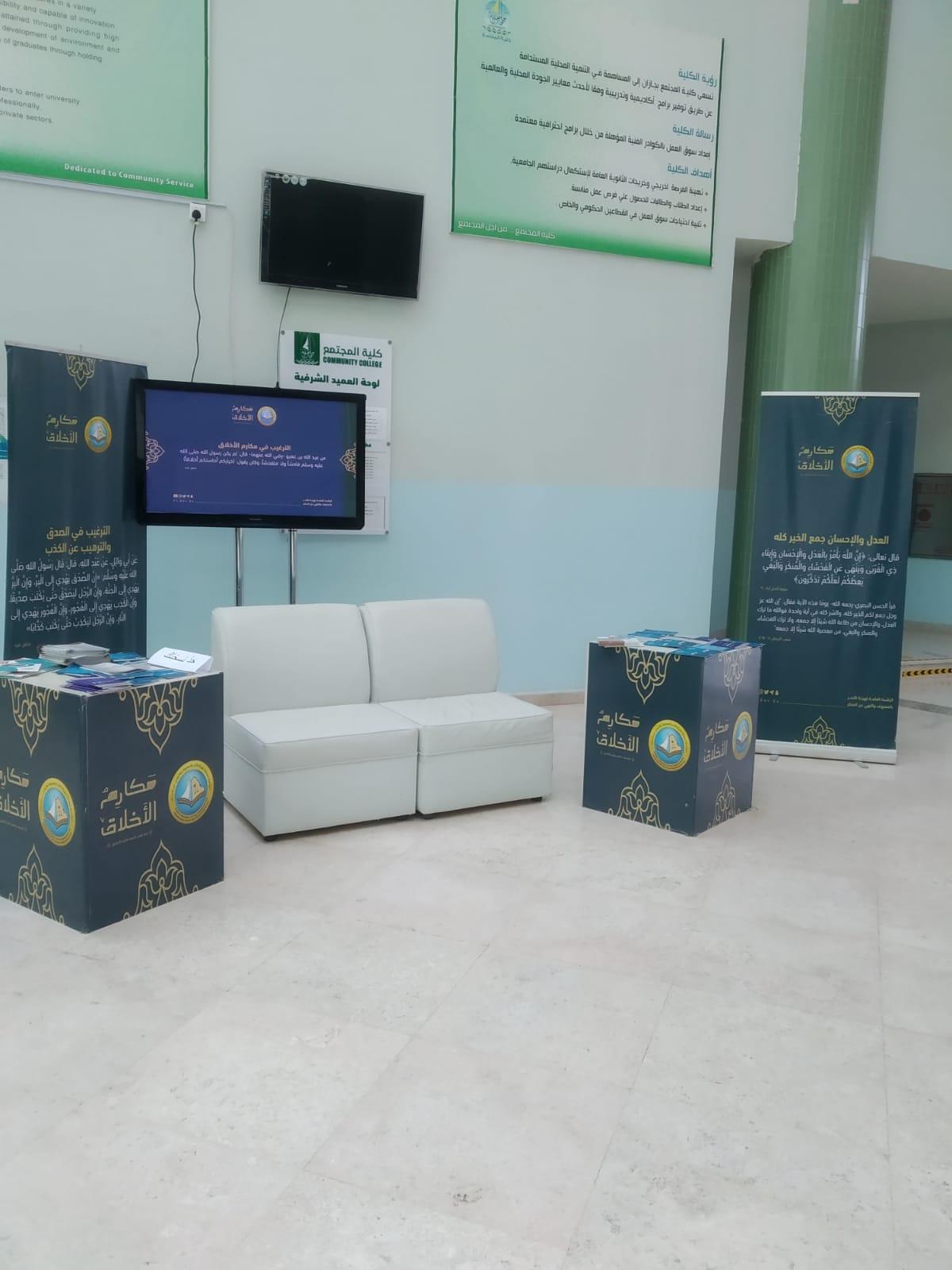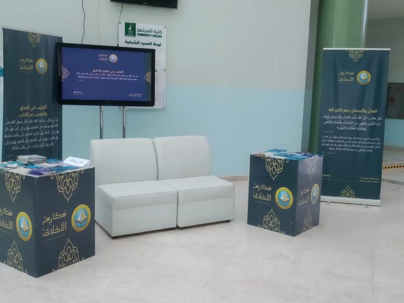 Jazan University, represented by the Intellectual Awareness Unit, in cooperation with the branch of the General Presidency of the Commission for the Promotion of Virtue and the Prevention of Vice in the Jazan region, held a mobile exhibition as part of the "Makarim Ethics" campaign, which aims to spread good Islamic morals in the community.