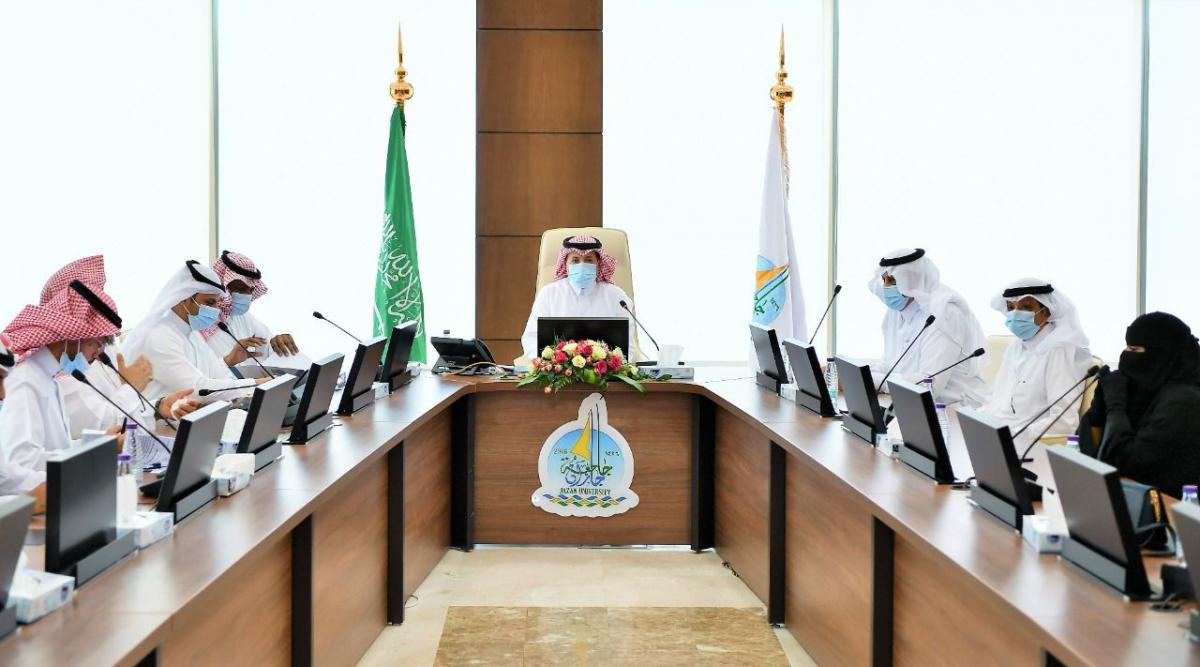 The Vice President for Postgraduate Studies and Scientific Research, Secretary of the University Council, Prof. Muhammad bin Hassan Abu Rasin, explained that the Council made a number of recommendations and decisions, including: appointing a number of Saudi faculty members (3 to the rank of assistant professor, 194 to the rank of lecturer) and approving, continuing and transferring scholarships (89) of teaching assistants and lecturers both male and female to pursue master’s and doctorate degrees in different disciplines. Awarding Master’s degree to (6) male and female graduate students, approving the restructuring of graduate programs (PhD degree - Master’s degree), and recommending the approval of merging the Department of (Pharmaceutical Chemistry) and Department (Pharmacology) at the College of Pharmacy in one department under the name of Department of (Pharmaceutical Chemistry and Pharmacognosy), and recommending approval of the amendment of the name of the Department of (Clinical Pharmacy) to the Department of (Pharmaceutical Practice), approving the formation of an investment committee to oversee the university’s investments, and approving the signing of a service contract between Jazan University and (QS).