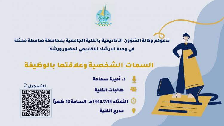 Samtah University College, represented by the Student Guidance Unit, organized a workshop entitled Personal Traits and their Relationships with the Job, carried out by Dr. Amira Bayoumi, in which she talked about physical and personal traits and self-skills as one of the factors affecting career choice.
