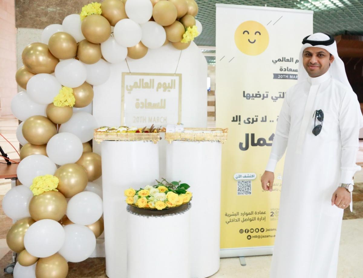 Jazan University, represented by the Department of Internal Communications at the Deanship of Human Resources, organized a celebration on the occasion of the International Day of Happiness, where a pavilion was organized in the lobby of the administrative tower in the University City, a number of university headquarters and the girls’ college complex in a locality.
