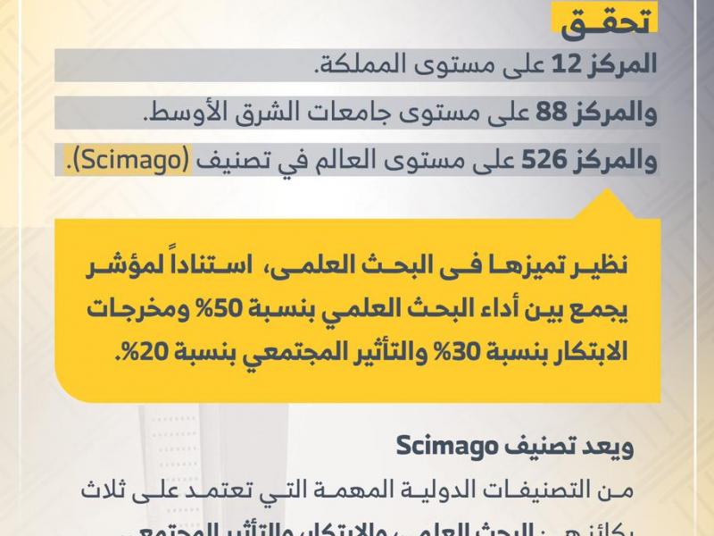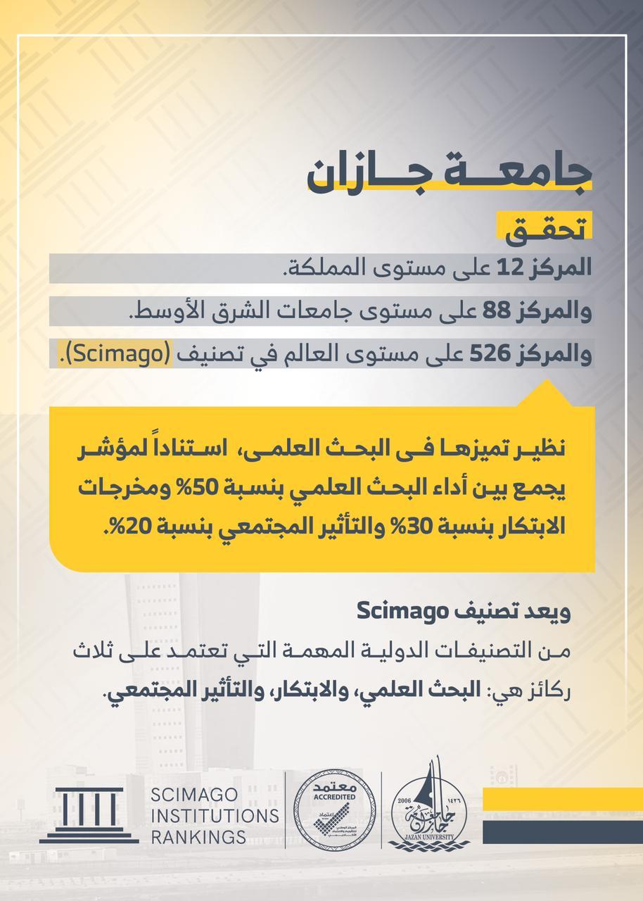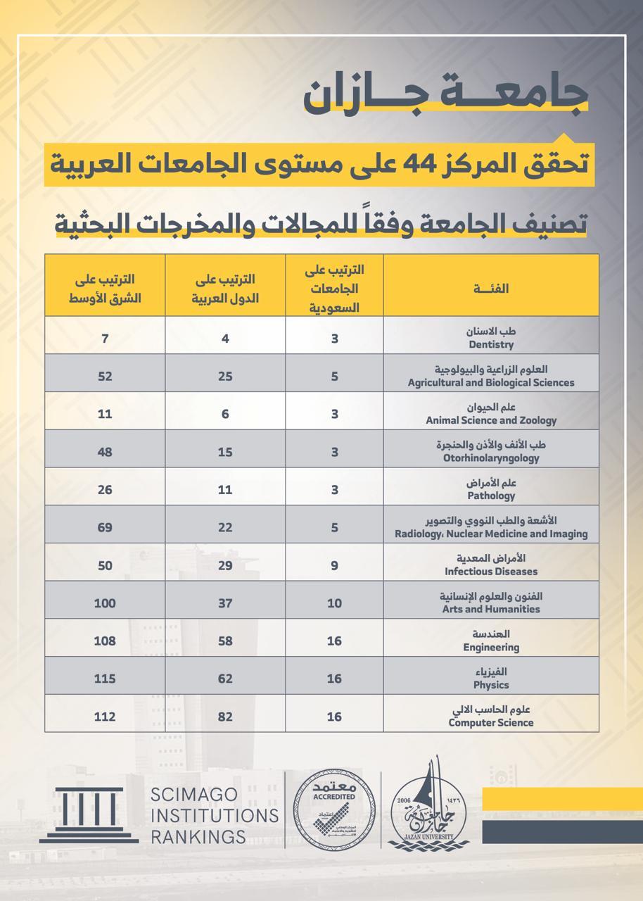 Jazan University is 12th nationally and 44th in the Arab world as per the Scimago classification