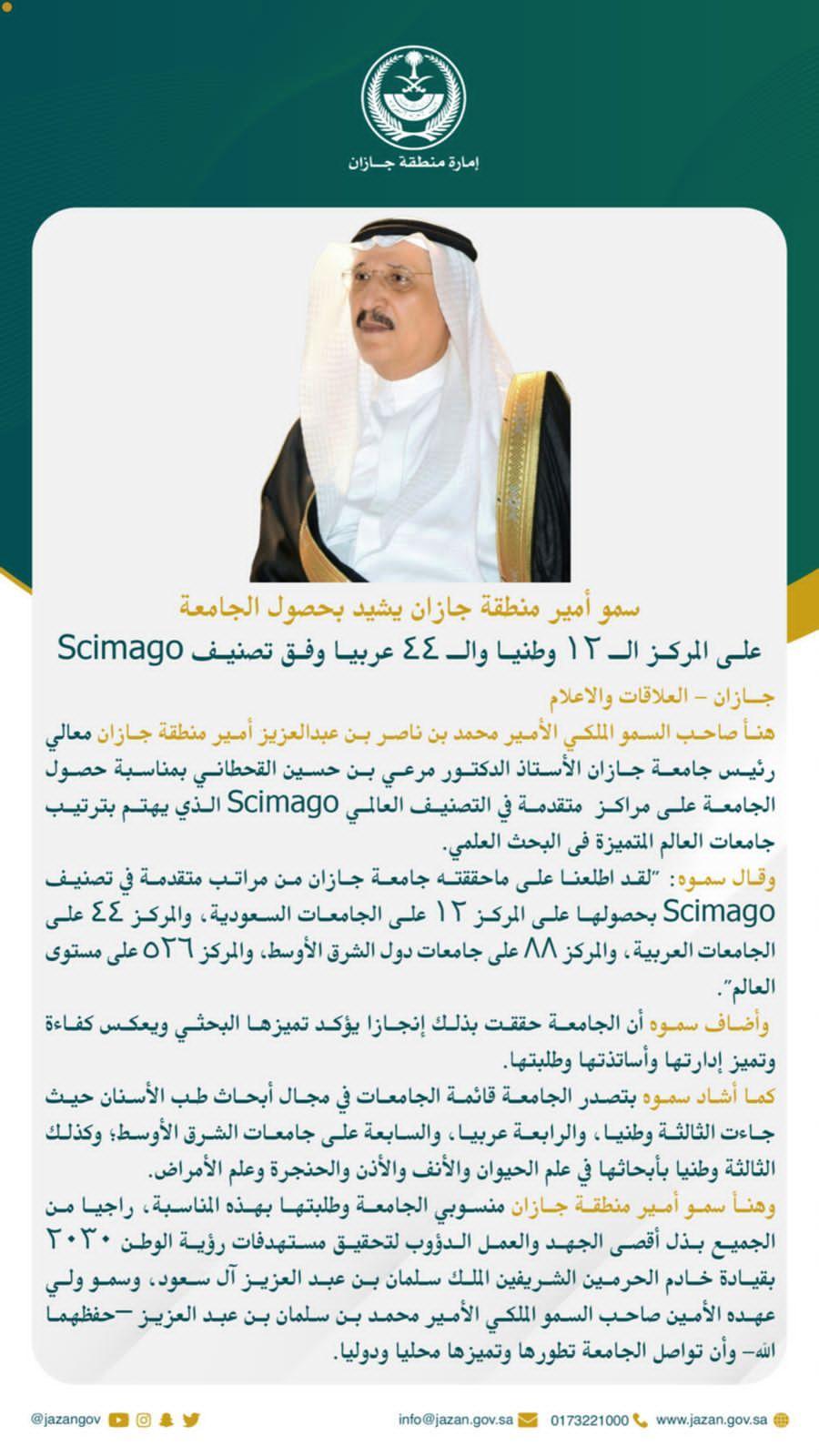 His Royal Highness Prince Muhammad bin Nasser bin Abdulaziz, Governor of Jazan Region, congratulated His Excellency the President of Jazan University, Prof. Mar’ei bin Hussein Al-Qahtani, on the occasion of the university’s obtaining advanced positions in the Scimago international classification, which is concerned with ranking the world’s distinguished universities in scientific research.