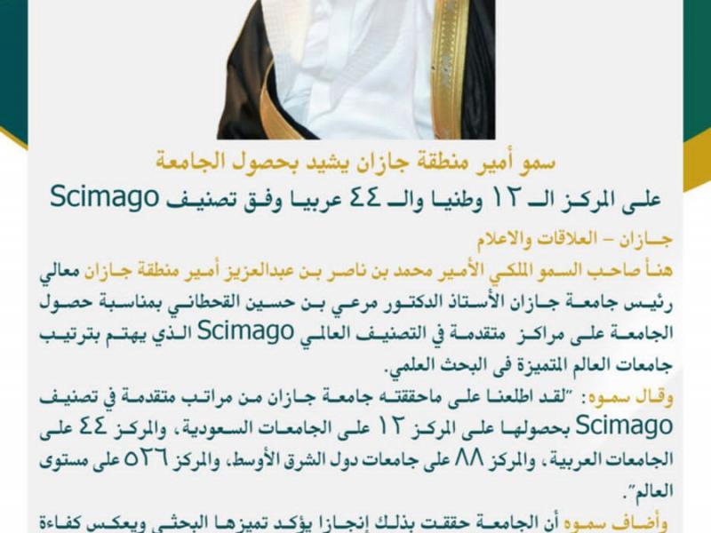 His Highness, the Governor of Jazan region, praises Jazan University for securing 12th position nationally and 44th among Arab states, as per the Scimago classification