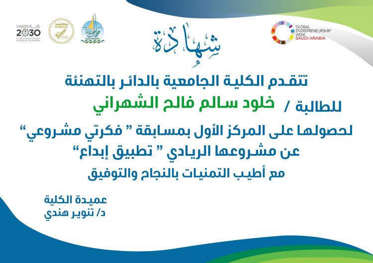 Student / Kholoud Salem Al-Shahrani at the third level in the Department of Nursing for her pioneering project entitled "