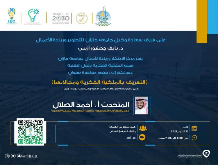 Then, the Head of the Intellectual Property and Technology Transfer Department at the Center for Innovation and Entrepreneurship, Mr. Ali Sallam, gave an introduction to the Intellectual Property Department and an introduction by Lecturer, Mr. Ahmed Al-Salal.