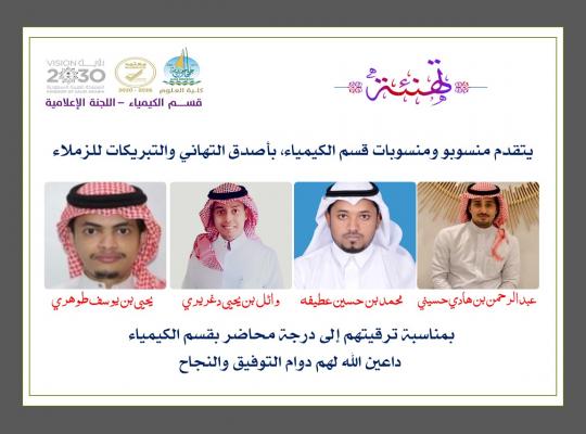 The staff of Chemistry Department congratulates the most sincere congratulations and blessings to the colleagues Abdul Rahman bin Hadi Husseini, Muhammad bin Hussein Atifa, Wael bin Yahya Daghiri, and Yahya bin Youssef Tohri, on the occasion of their