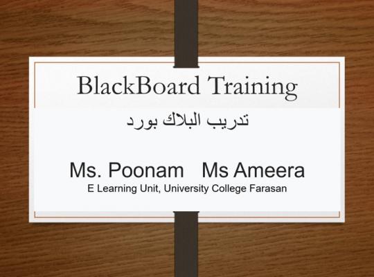 How to access " Blackboard " program: A workshop at the University College of Farasan The University College Farasan, represented by the Learning Resources and E-Learning Unit, implemented a workshop entitled "How to access the Blackboard program"