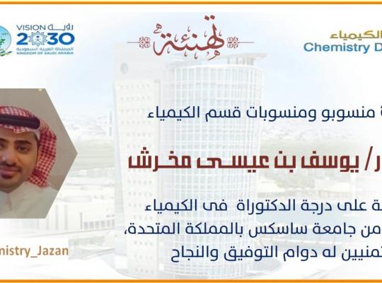 The staff of the Department of Chemistry congratulate Dr. Youssef bin Issa Mukhresh, for receiving his Ph.D. in Organic Chemistry from the University of Sussex in the United Kingdom, wishing him continued success.
