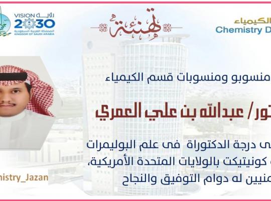 The employees of the Department of Chemistry congratulate Dr. Abdullah bin Ali Al-Omari for receiving his doctorate degree in polymer science from the University of Connecticut, United States of America, and wished him success.