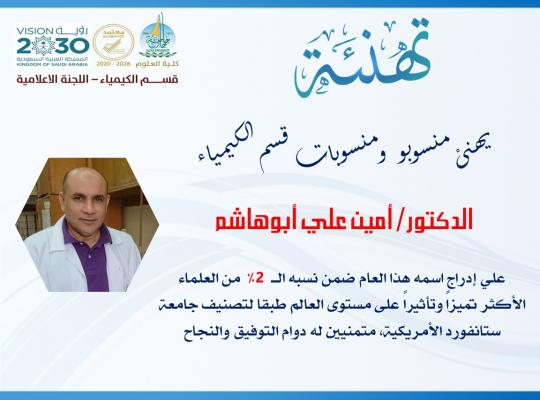 يهنئ منسوبو ومنسوبات قسم الكيمياء الدكتور/ أمين علي أبوهاشم الاستاذ المشارك بقسم الكيمياء لإدراج اسمه هذا العام ضمن نسبه الـــ 2% من العلماء الأكثر تميزاً وتأثيراً على مستوى العالم طبقا لتصنيف جامعة ستانفورد الأمريكية، متمنيين له دوام التوفيق والنجاح
