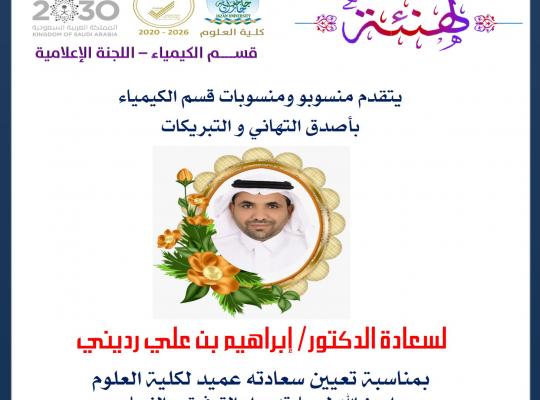 The staff and employees of the Department of Chemistry congratulate Dr. Ibrahim bin Ali Rodini on the occasion of the issuance of a decision appointing him as Dean of the College of Science, praying to God for his success and success.