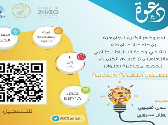 Samtah University College, represented by the Student Activity Unit, in cooperation with the Department of Chemistry, implemented a lecture entitled (Inspirational and Positive Stories), which was carried out by Ms. Nada Fakihi and Ms. Rozan Al