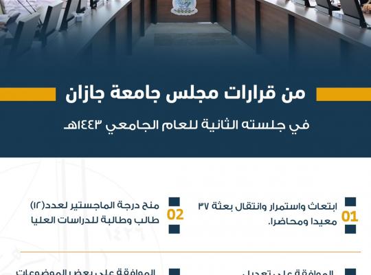 Jazan University: Media Department The Council of Jazan University, in its second session for the academic year 1443 AH, was held under the chairmanship of His Excellency the President of the University, Prof. Mar’ei bin Hussein Al-Qahtani. It was