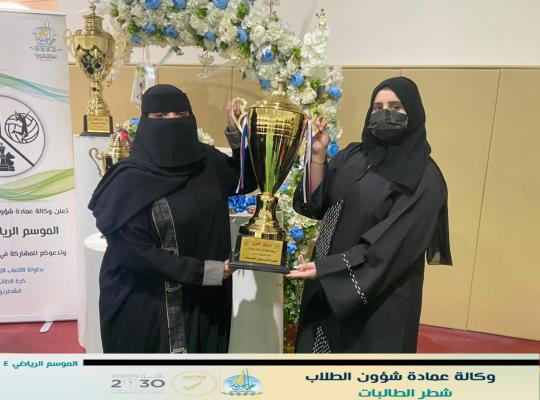The Vice Dean of Student Affairs for the female section, Dr. Ashwaq Othman Al-Bakri, crowned the winning colleges in the volleyball championship and the college. The University College of Samtah won the first place, and the College of Jam in Al-Ayyeh